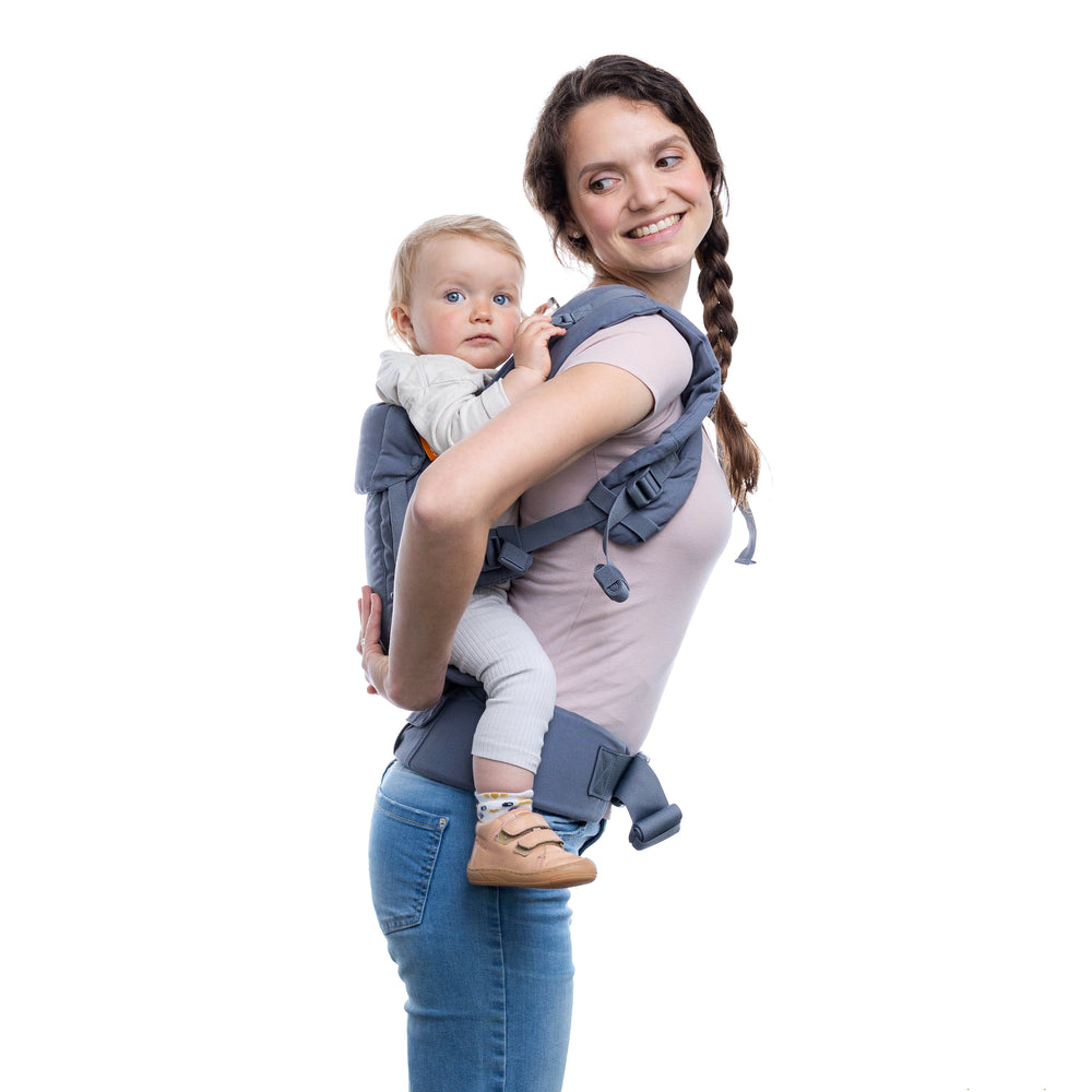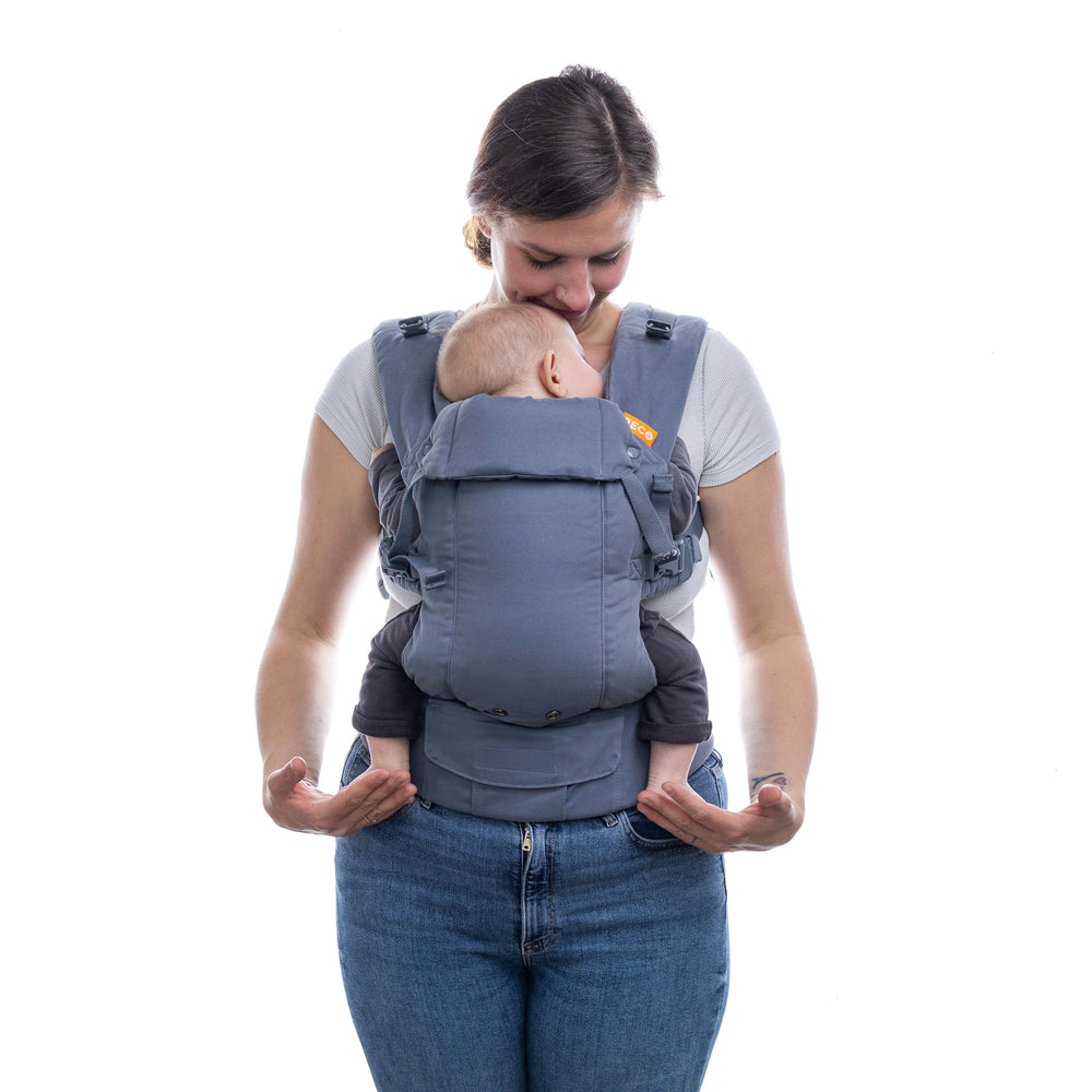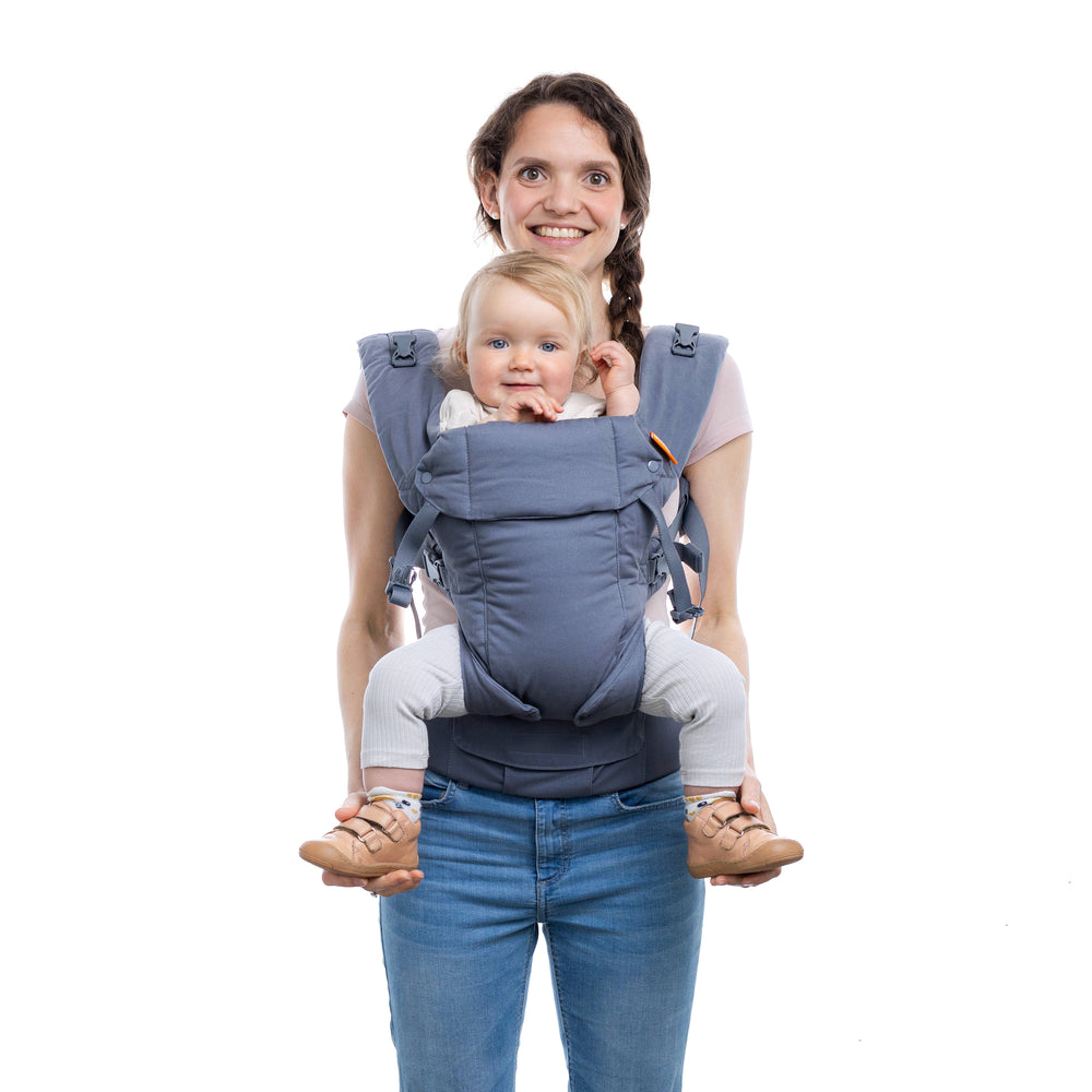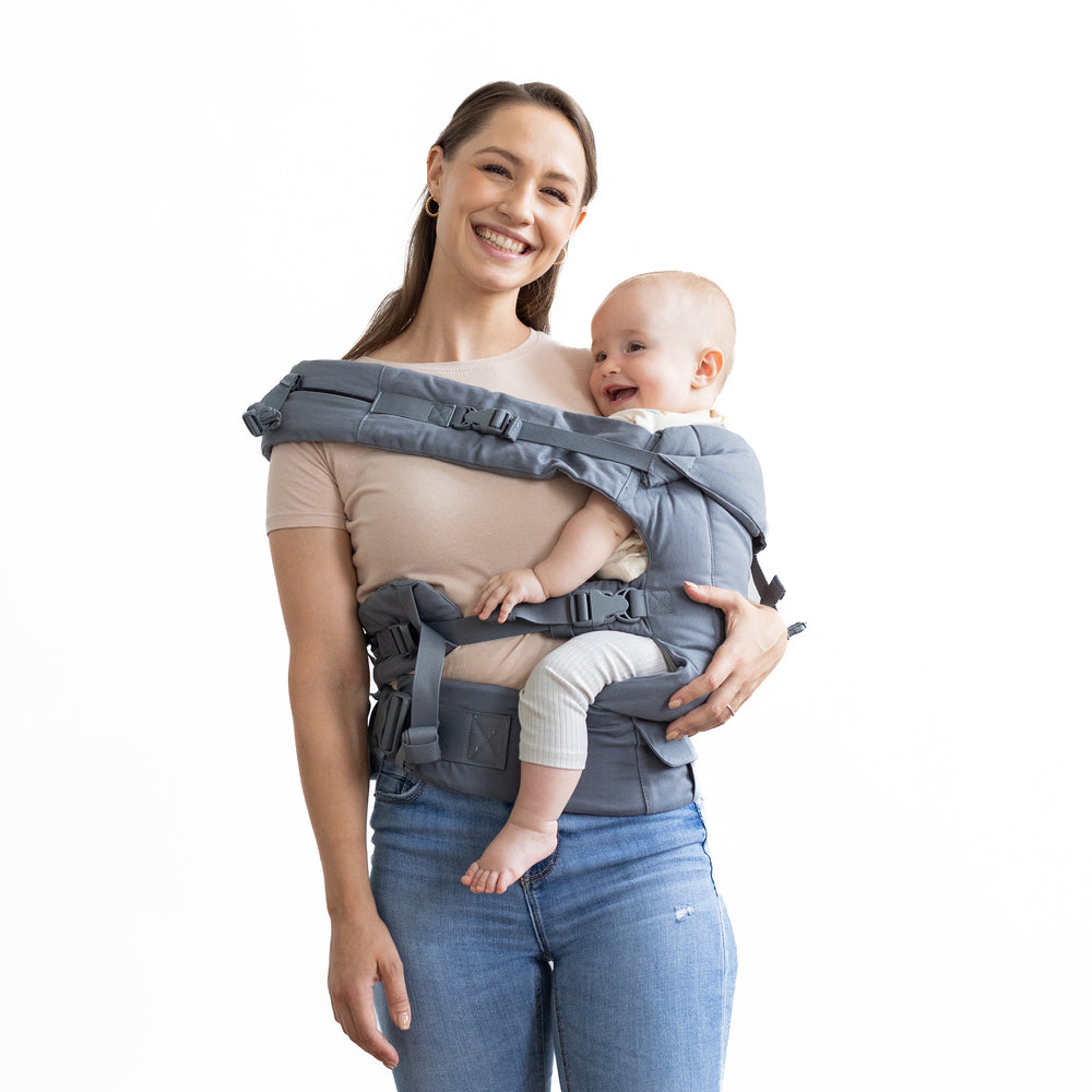 Adjust all the straps for a snug fit and once positioned correctly, your baby should be high on your chest, and the carry should feel secure, like when you're holding them in your arms.